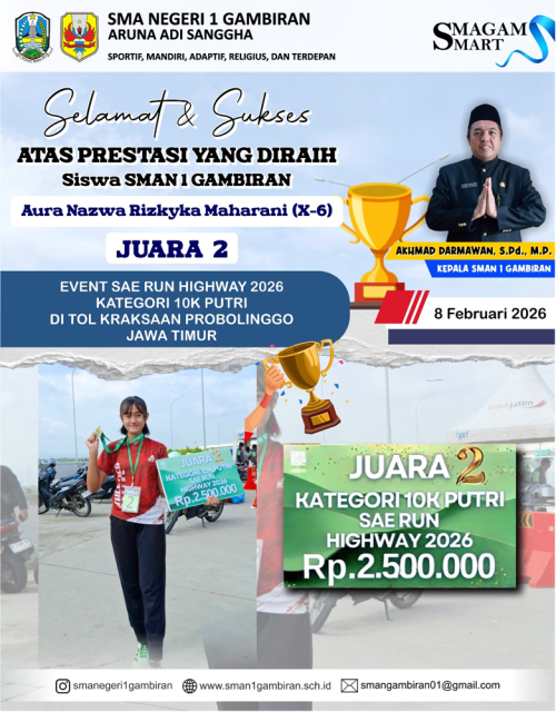 Dengan raihan Juara 2 SAE RUN Probolinggo 2026 ini, Aura Nazwa Rizkyka Maharani kembali membuktikan bahwa ketekunan dan konsistensi latihan merupakan kunci utama meraih prestasi. SMA Negeri 1 Gambiran pun semakin menegaskan komitmennya dalam mendukung dan mencetak siswa-siswi berprestasi yang mampu bersaing di Tingkat Provinsi Jawa Timur.